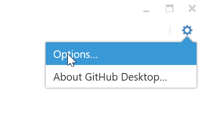 Open GitHub Desktop, and in the upper right-hand corner, click the Gear icon and select Options.