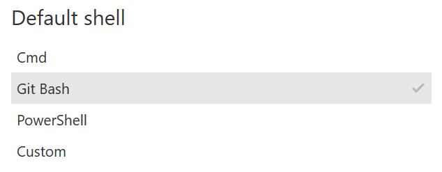 Now select your preferred shell. For me it is Git Bash, because I’ve never taken the time to learn PowerShell (I know! It’s as embarrassing as when I was still using Ctrl+c Ctrl+v as my source control a few years back).