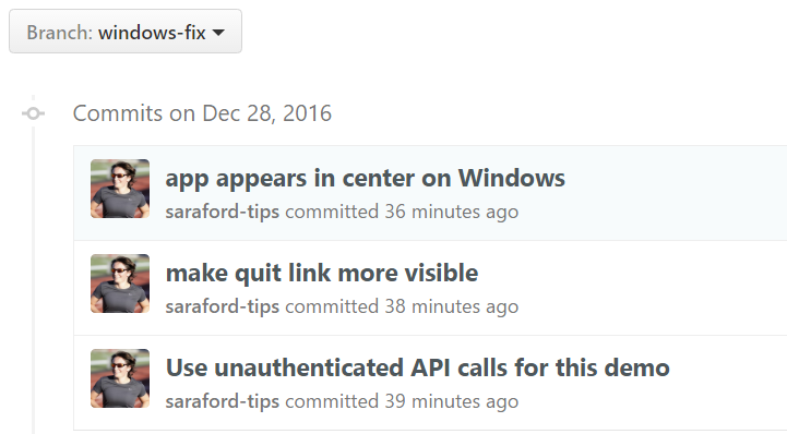 and if you switch to this branch (by clicking the branch name in the previous image), you’ll see the 3 commits listed there.