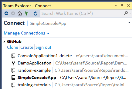 In the interest of time, I’m going to assume you are 1. connected to GitHub (either by signing in via Team Explorer or the GitHub tool window) and 2. in Team Explorer, you’re connected to a GitHub repo, as shown below