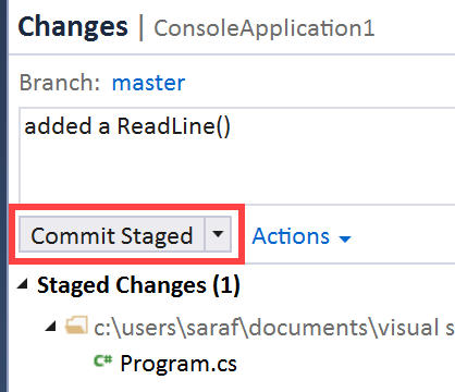To confirm what is happening, open the command prompt, and run git status. You’ll see that you’ve essentially did a git add Program.cs but via Team Explorer.