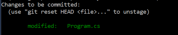 and via the command line, I’ll run git add Program.cs (or git add . since it is the only file modified) to add it to staging.