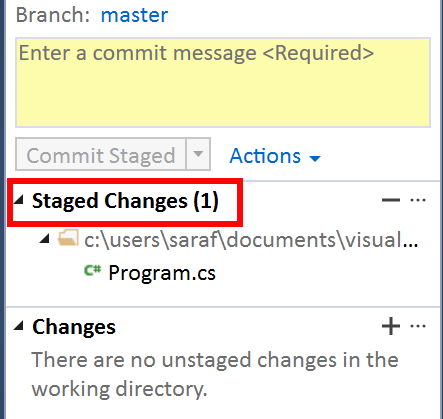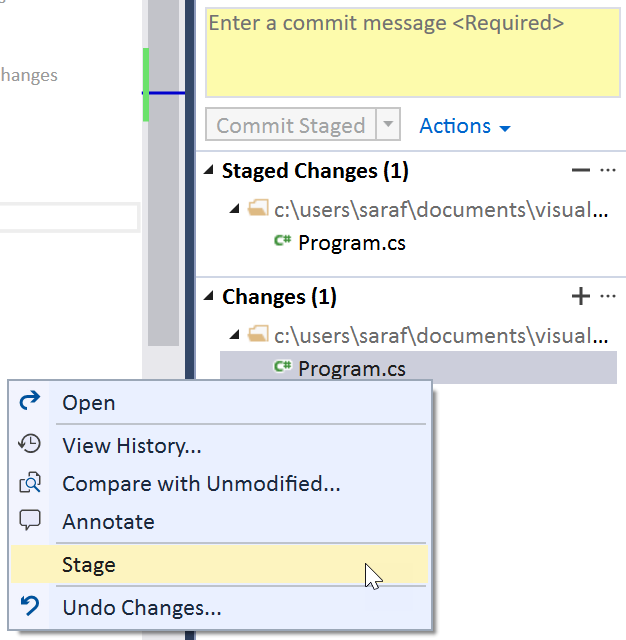 Next, let’s make that first line change of Console.WriteLine(MyStrings.message); but this time instead of hitting Commit All, you want to right click and hit “Stage”