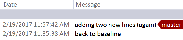 And now checking the history (Status Bar – Click Master (or whatever branch) then View History shows the two commits (baseline and the two new lines).