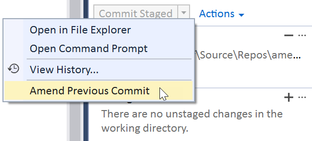 It looks like Team Explorer will let you amend based on whatever changes are in the working directory, but just in case you only want to change one file, I’d suggest staging the file(s )you want to amend first. In a command line scenario, whatever files are in staging are the ones that will be amended. (See previous tips)