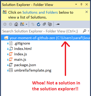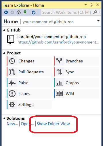 Now let’s say you connect to the your-moment-of-GitHub-zen repo via Team Explorer in Visual Studio 2015. But oh-no! Your solution explorer will be empty. After spending a year using Atom, it’s really odd feeling when none of your files appear available in your editor. (See! I told ya’ll I could justify forgetting about a solution file!)