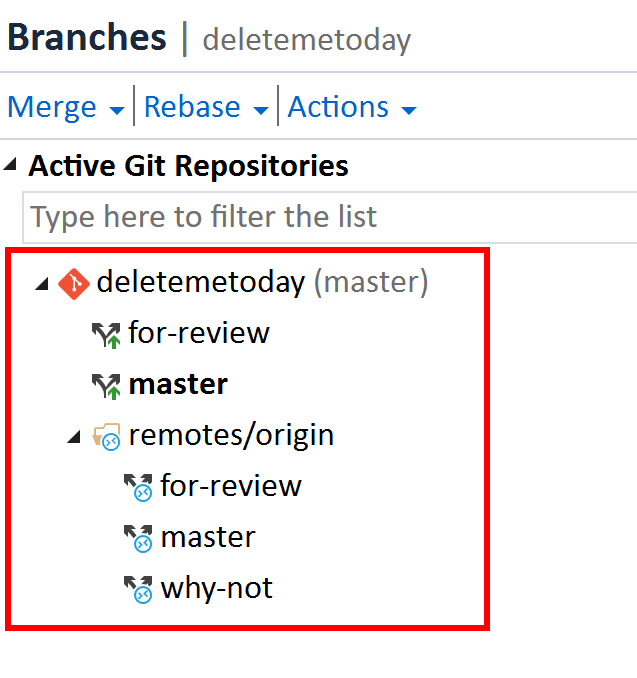Something that has confused me for a long time until I wrote yesterday’s post was whether “remotes/origin/why-not” was the same as “origin/why-not” or even the made-up “remotes/why-not” (which I don’t think a branch is ever referred to as such). Now that I can visualize what both the command line and Visual Studio are doing, it’s easier to get my head wrapped around these remote tracking branches.