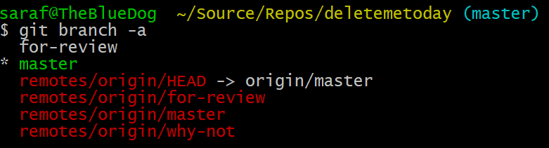 Note how the local branch `for-review` is listed first (which kinda gets blended in color-wise with the command), then master, then the remote tracking branches.