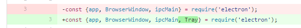 And now we have “the what” for what has changed in the file. The “Tray” const was added to the list, giving it a type of Electron.Tray, so I could put the app in the Taskbar tray (or Mac tray thingy at top of screen).