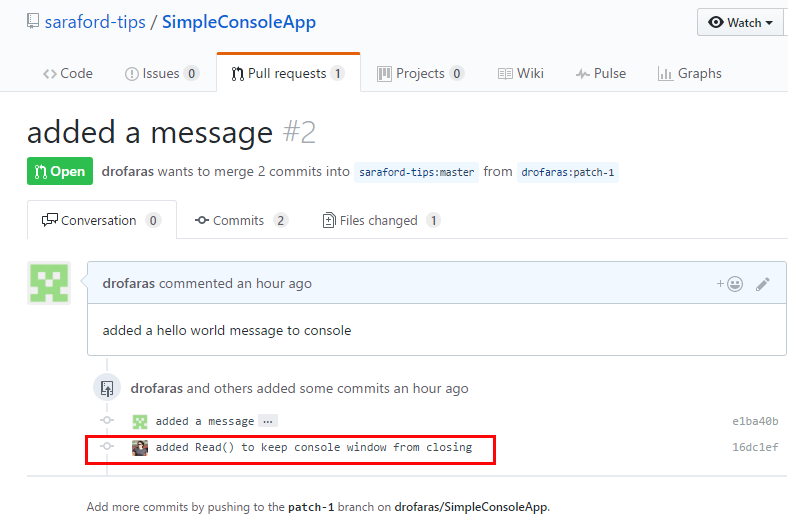 Let’s take a minute to review what’s going on here. Remember a Pull Request is the start of a conversation. The actual code for the Pull Request sits on a branch that can be updated at anytime, hence why I say a pull request is the “start” of a conversation. In the past, this branch would be updatable by the person who created it. Now because of the new feature upstream repository contributors to collaborate on a forked branch, the user saraford-tips was able to make changes directly to the branch associated with the Pull Request from user drofaras.