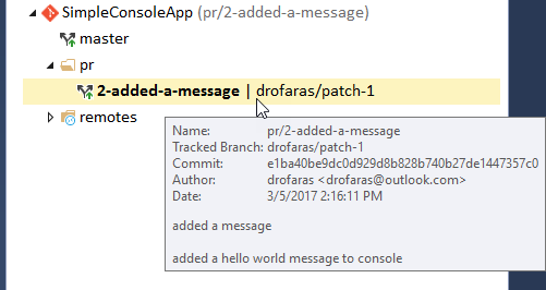 If you want to verify what state you are in, you can go to Team Explorer – Branches to confirm you’ve checked out a PR branch. Hovering over gives you additional information. You can also view in the VS status bar.
