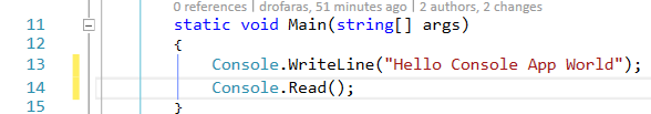 In this example, I want to add a Console.Read() under the Console.WriteLine() that came from the Pull Request.